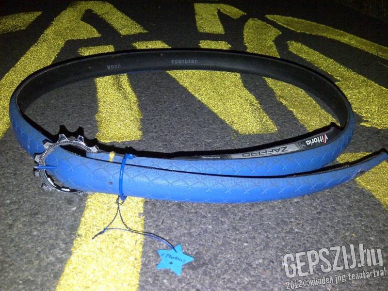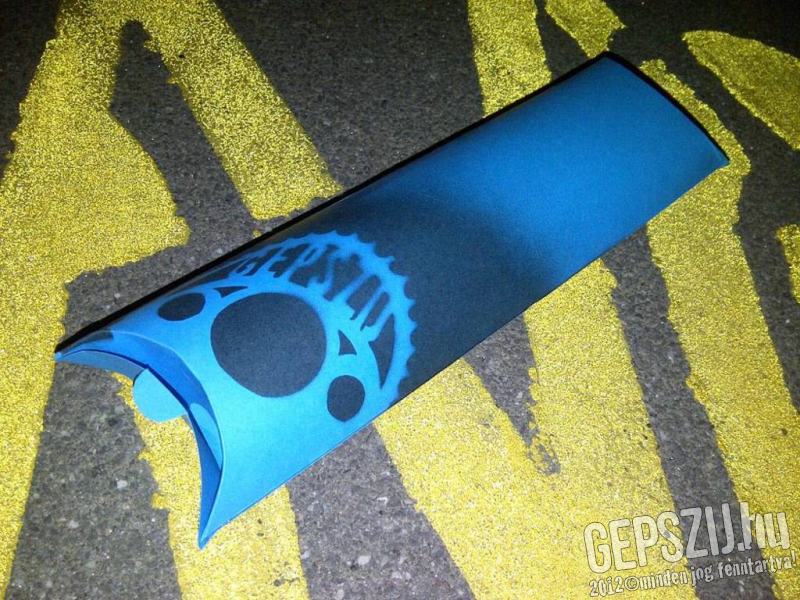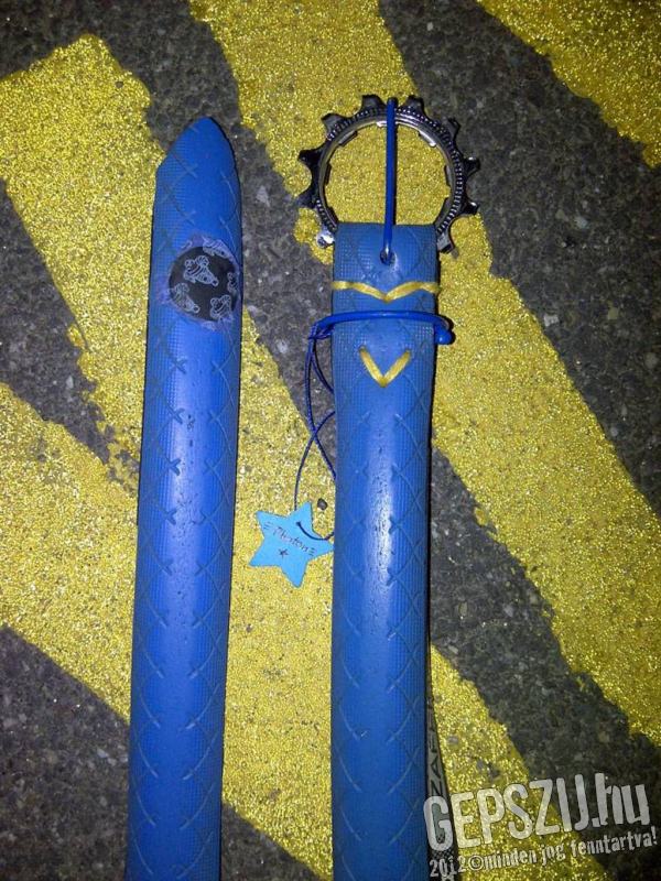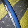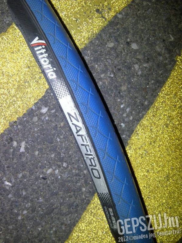Kék Vittoria országúti külső - racsni csattal, kék küllőből hajtogatott nyelvvel és bújtatóval. Mindez sárga varrással és Michelin folttal megspékelve. 6300Ft
