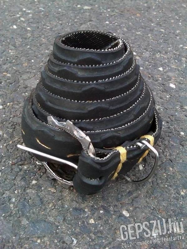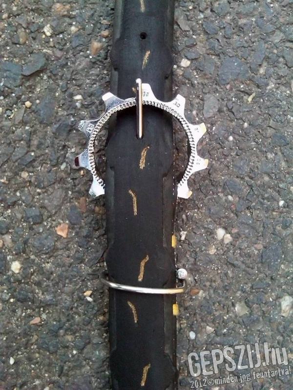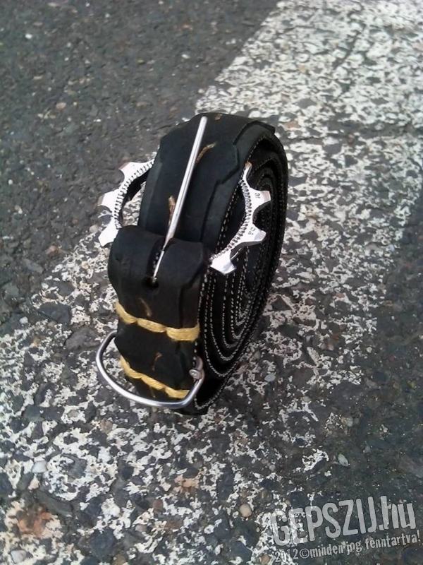 Keskeny, de vastag trekking öv. Kelly's trekking gumija, melybe magam beletoltam vagy 2000km-t :) Vagány fogaskerék csat, DT küllőkből a nyelv és a bújtató, arany cérna varrás és arany sorminta a futón.