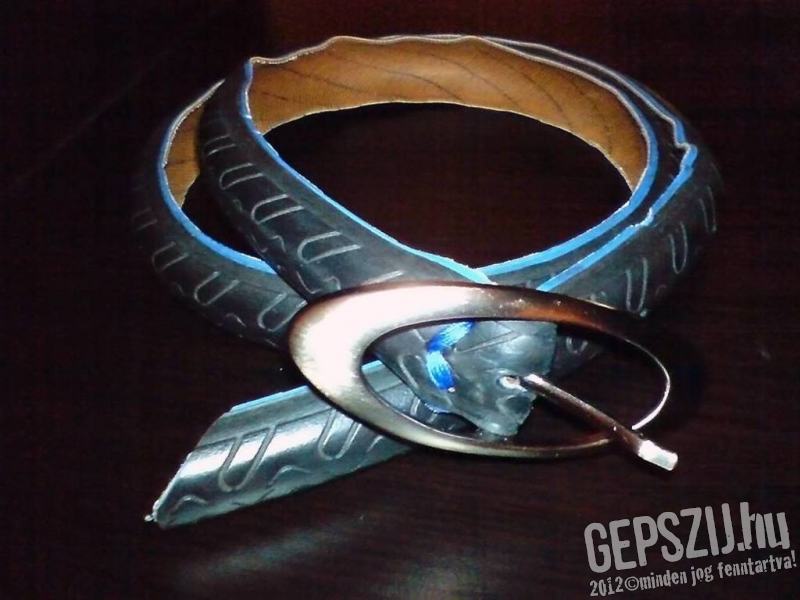 Félgömbölyű rövidített Vredestein kevlár öv kifejezetten hölgyeknek. Két szélén a futófelület alól szolídan kilógó kék kevlár csíkkal és ehhez illő kék varrással. Ezüst színű ovális csattal.