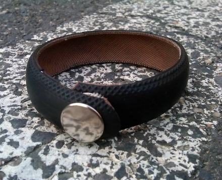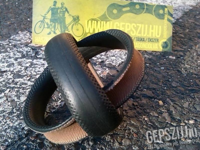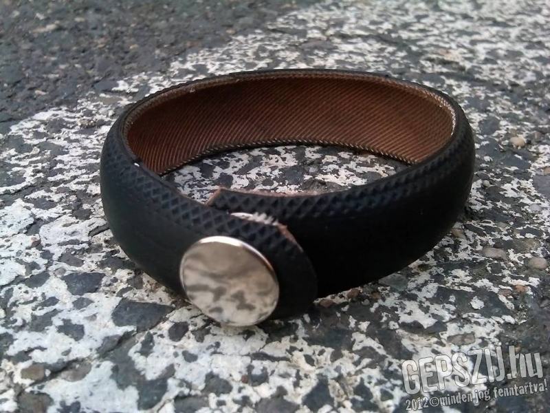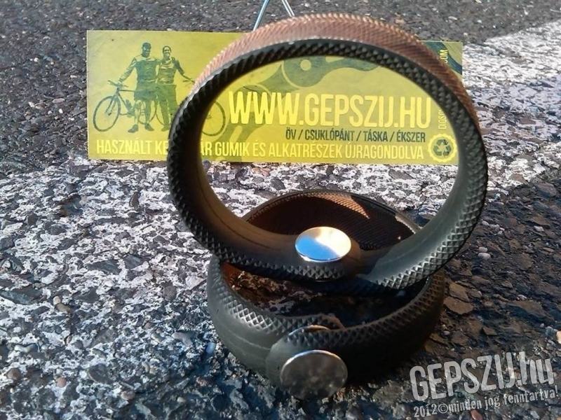 Egyszerű slick országúti gumiból készült szolíd karperec, mely bármikor hordható. Két szélén apró pöttyözött textúrával. 1200Ft