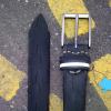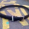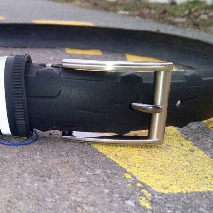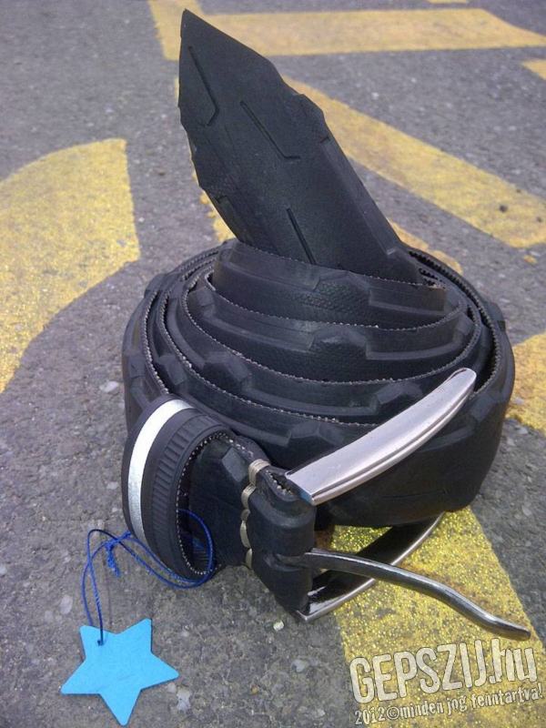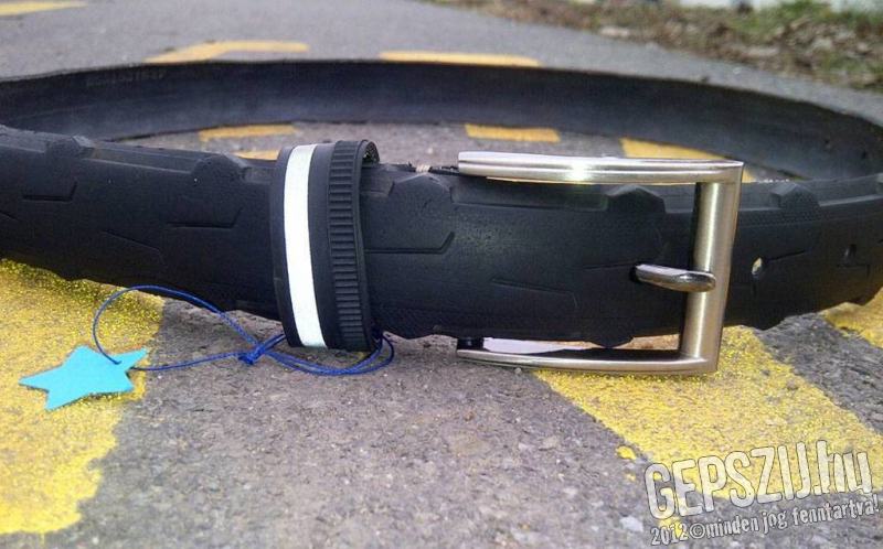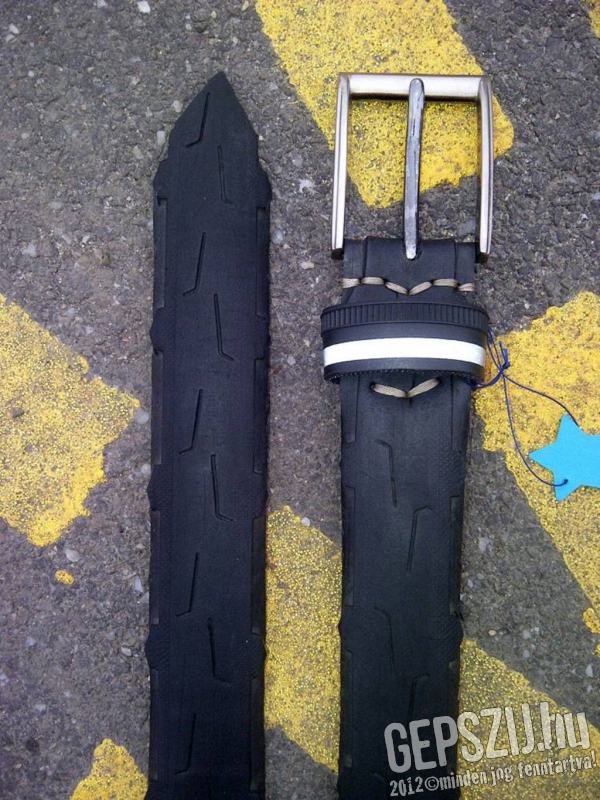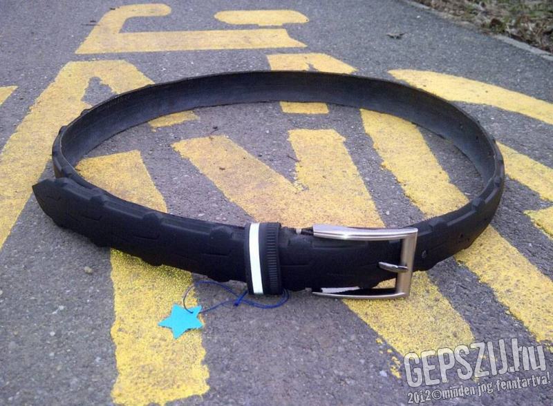 Városi aszfaltgumi-öv fényvisszaverő bújtatóval. Masszív fekete slick gumi klasszikus krómozott csattal. Az öv hossza 125cm, szélessége 35mm. 5000Ft
